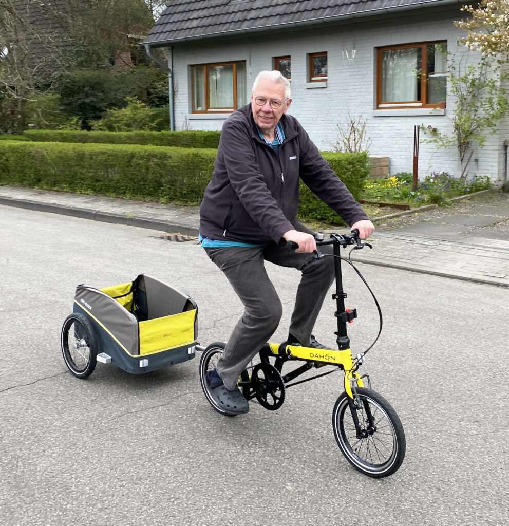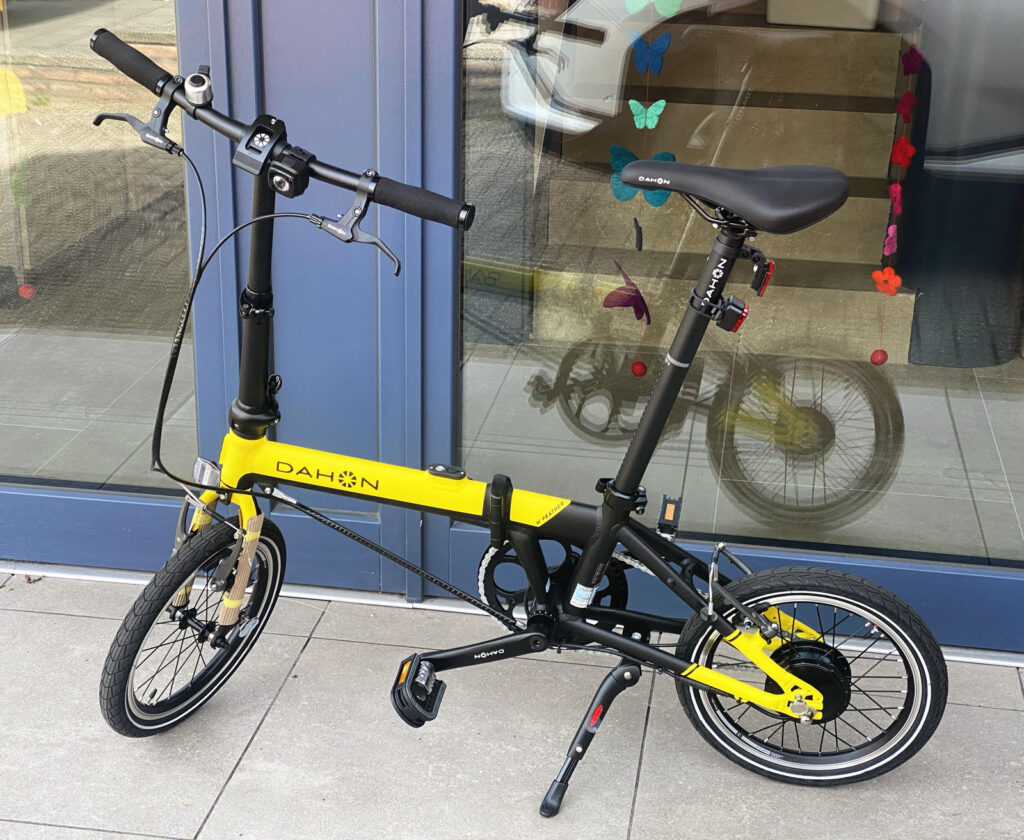 Eine Rolle spielt bei allem auch mein neues Bord Bike. Ein ziemlich klein zusammenfaltbares Rad von Dahon vom Typ K-Feather. Ist ein E-Bike und wiegt trotzdem nur 12 Kilo. Hat allerdings weder eine Schaltung noch verschiedene Unterstützungsstufen. Man kann den Motor nur ein- oder ausschalten – Punkt. Dafür hat es allerdings einen Drehmomentsensor, der die Stärke meines Pedaltritts ermittelt und das automatisch in erhöhte E-Unterstützung umrechnet. Kurz: je stärkter ich reintrete, desto mehr strengt sich auch der Motor an. Klappt prima, auch bei Steigungen und mit Anhänger hinten dran.