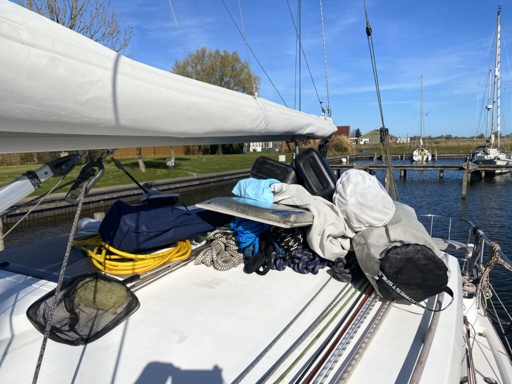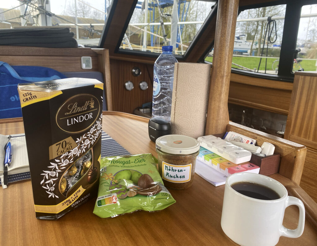 Genauer: Ostern 2026. Ich bin eine Woche an Bord, um das Boot für die Saison und höhere Aufgaben vorzubereiten. Die to-do-list ist lang, ich hab keine Langeweile. Aber ich gönne mir auch Pausen und ausführliche Schnacks mit Freunden und Liegeplatzkollegen, die ich ja schließlich fast ein halbes Jahr – naja, 5 Monate – nicht gesehen habe.