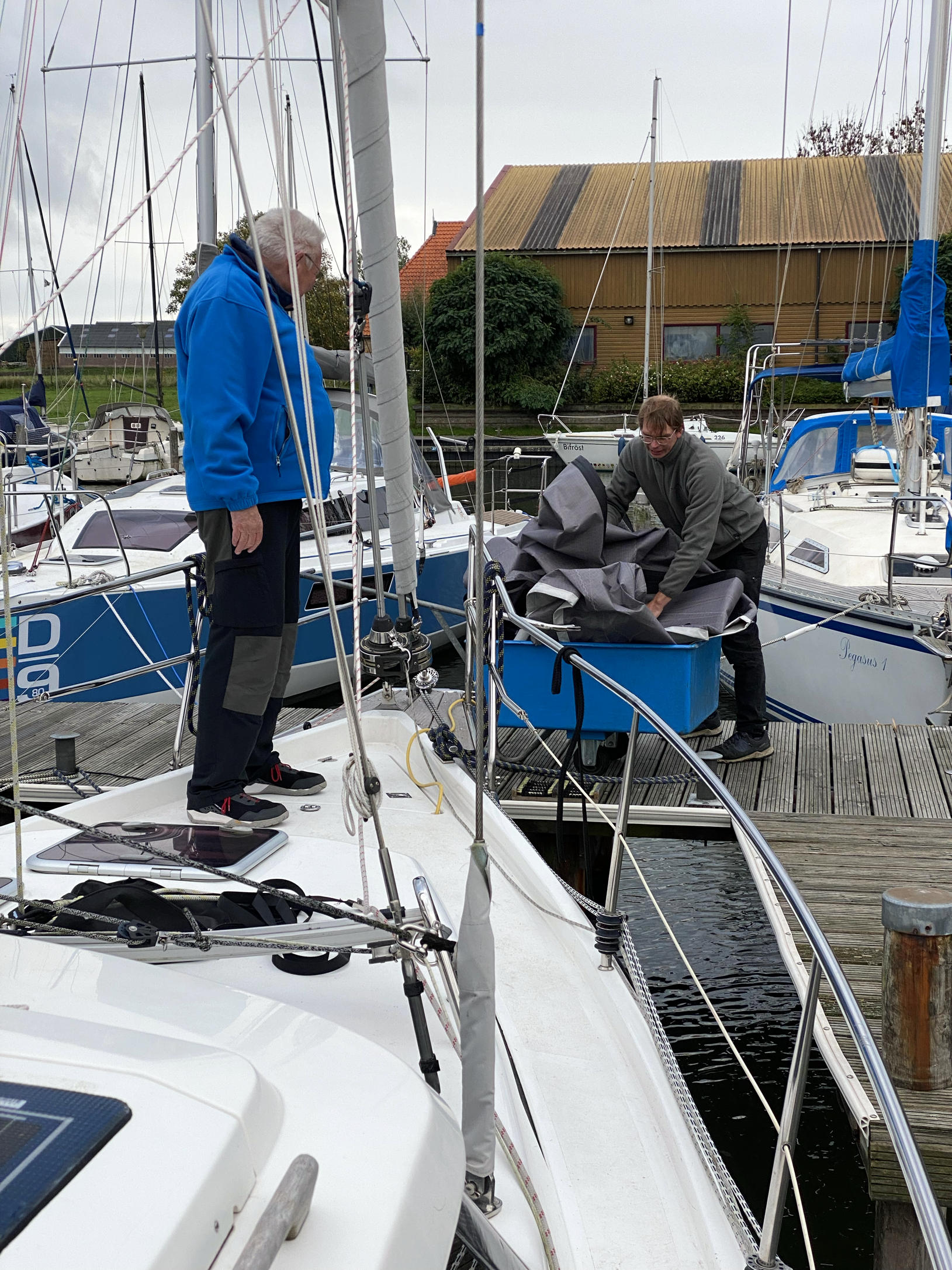 Nachdem Ole noch eine Woche segelt, übernehmen Sigrid und ich die Wintervorbereitungen. Die Segel werden abgeschlagen und kommen zum Segelmacher ins Winterlager. Ich baue ein selbst ausgedachtes Pumpensystem für die Restentwässerung der Frischwasseranlage ein (das sich später tatsächlich als sehr hilfreich erweist), und schließlich feiern wir das Saisonende in unserem Hafenrestaurant Greate Pier.